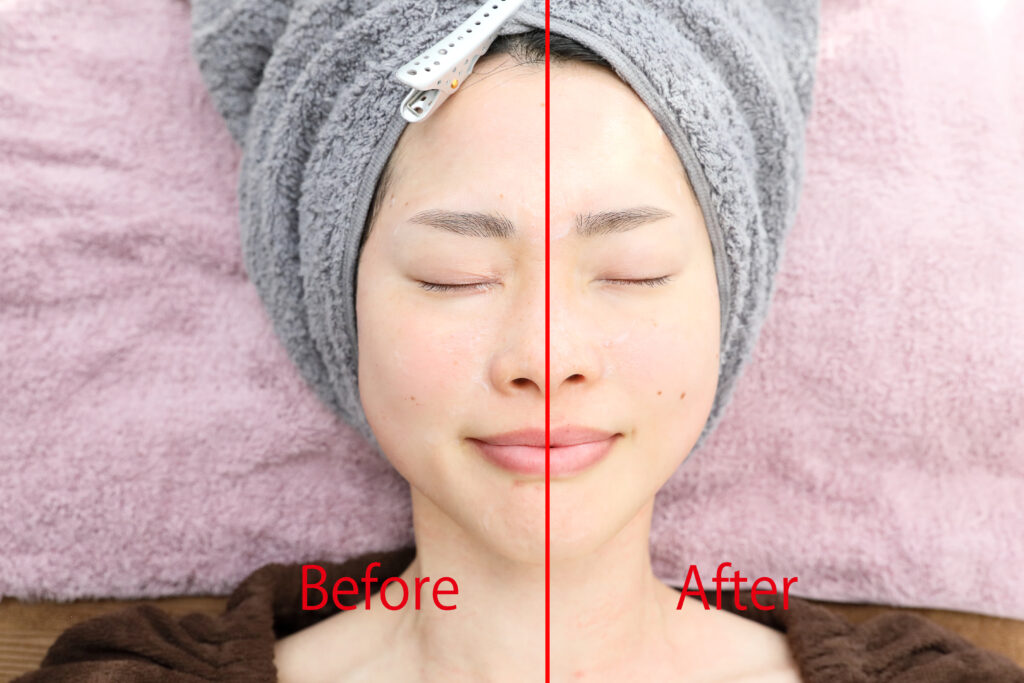 〈事後効果〉として、1~2週間かけながら肌の水分保持量のアップ、ハリ・ツヤ感、化粧ノリが良くなるなど様々な美肌効果が出現してきます。これはコラーゲンの産生を誘発できていることによるものです。